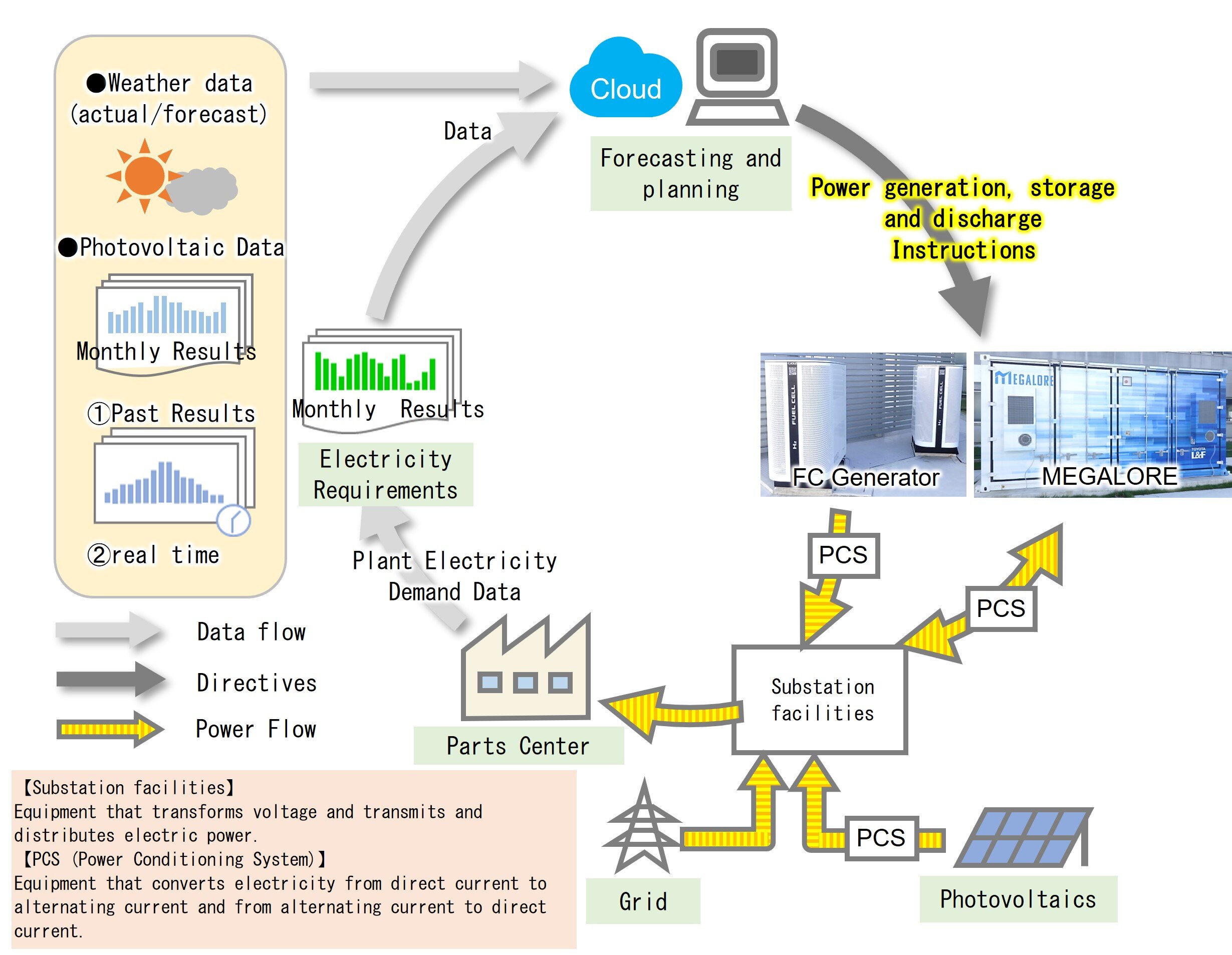 Located at our Takahama Plant, “E PLAZA” combines solar power generation, the stationary energy storage system “MEGALORE”, and an “FC generator” powered by our FC modules to demonstrate an effective way of utilizing renewable energy.